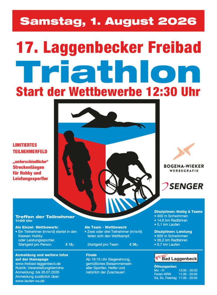 Nun zum 17. Mal findet unser bereits zur Tradition gewordener Laggenbecker Freibad Triathlon (LFT) statt.