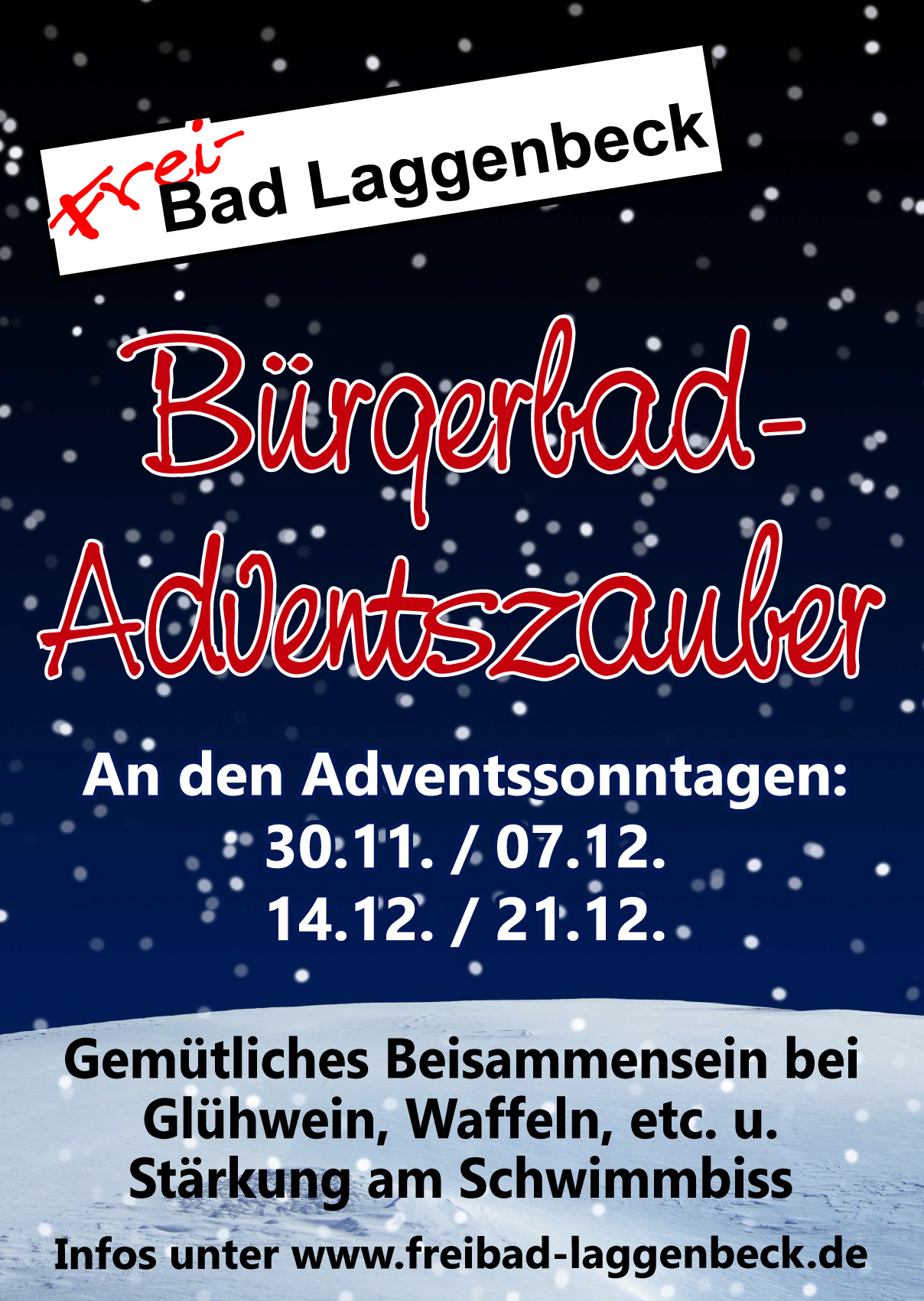 Ho ho ho………… die Weihnachtszeit klopft bald an die Tür des Freibades Laggenbeck und endlich öffnet sich das Tor wieder. Wir freuen uns sehr, alle Bürger*innen im Freibad an den 4 Adventssonntagen begrüßen zu dürfen. Weihnachtlich geschmückt präsentiert sich im winterlichen Glanz das sonnenverwöhnte Freibad. Es lädt ein zum Verweilen an der Feuerschale, die die großen und kleinen Gäste wärmt, um mit Glühwein, leckerem Kakao sowie warmen Waffeln die Menschen aus Laggenbeck sowie Nah und Fern zu verwöhnen. Auch der „Schwimmbiss“ lädt zum Genießen ein.